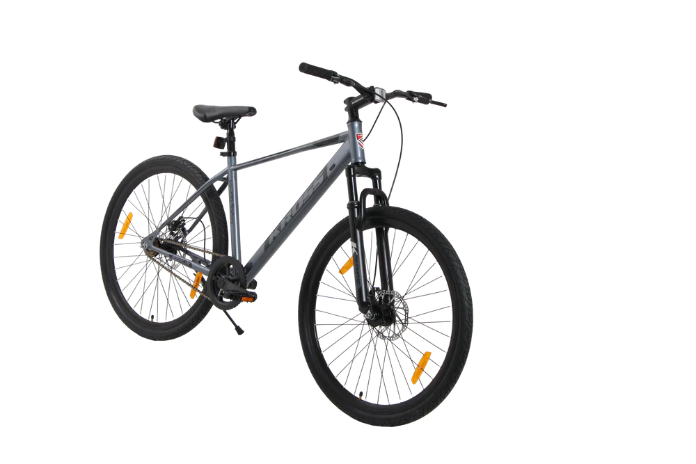 The Kross Berlin 27.5T is built for power, stability, and smooth rides across city streets and light trails. Featuring an ergonomically designed TIG-welded steel frame with internal cable routing and hybrid geometry, this MTB offers durability, control, and comfort. Equipped with a 27.5” suspension fork, dual mechanical disc brakes, alloy double-wall rims, wide tyres, sealed bottom bracket, cotterless crankset, and high-traction grips, it ensures a confident ride for riders aged 12 and above. Perfect for teens and adults, the Berlin 27.5T combines performance, style, and reliability in one package.