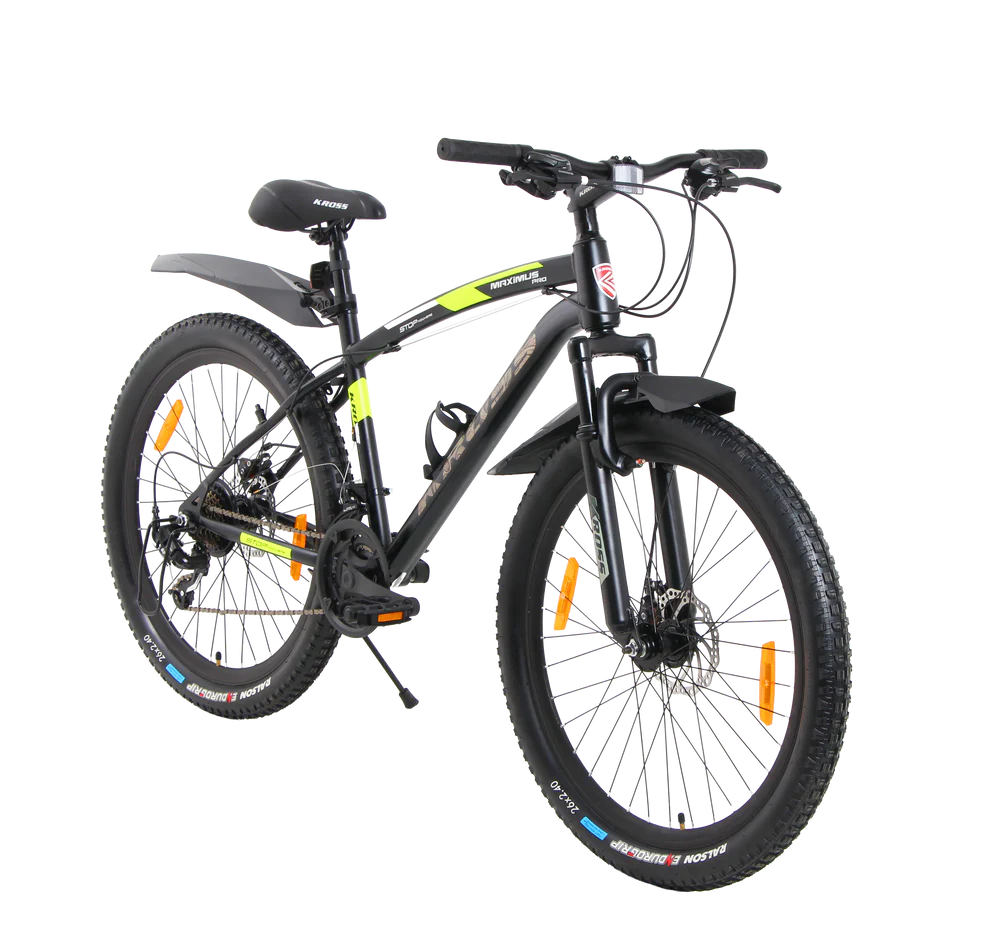 The Kross Maximus Pro 26T (21-Speed) is a performance-ready MTB built for daily rides, fitness, and rough terrain. It features a strong TIG-welded steel frame, responsive suspension fork, and dual mechanical disc brakes for powerful stopping. The wide 26×2.40” tyres offer superior grip and comfort, while the Shimano Tourney 21-speed drivetrain ensures smooth gear shifting on climbs and flats. Equipped with alloy double-wall rims, comfortable saddle with QR, wide MTB handlebar, and heavy-duty side stand, this bicycle is designed for durability, control, and rider comfort.
