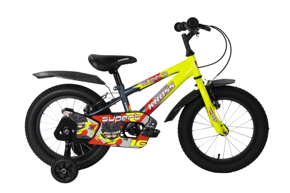 The Kross Superb 16T is designed for young riders who love comfort, control, and a sporty look. Built with a durable steel frame (21.5 cm) and rigid fork, this bicycle ensures smooth rides on every terrain. The double blend raised handlebar with extended stem offers better posture and handling, while front and rear V-brakes provide efficient stopping power. Its comfortable saddle with quick release and alloy rims makes it a perfect mix of style and stability for kids aged 6–9 years.