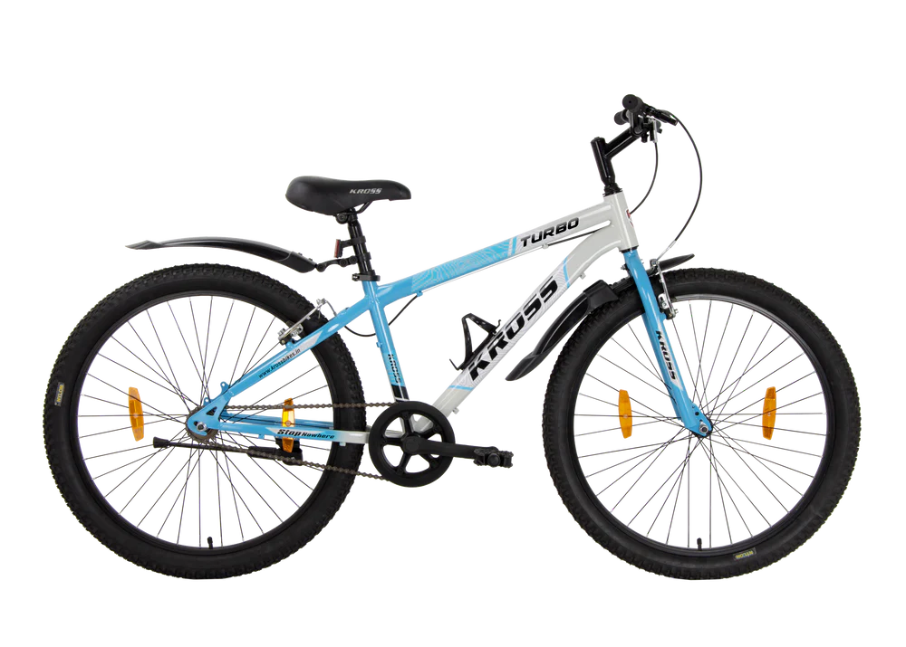 The TURBO 26T Single Speed MTB is built for riders who want a strong, simple, and reliable bicycle for daily commuting and fitness rides. Designed with a sturdy 38 cm steel MTB frame and a rigid fork, it delivers stable handling and efficient power transfer. The front and rear V-brakes ensure dependable stopping performance, while the 26 × 2.40 tyres mounted on double-wall alloy rims provide durability and road grip.